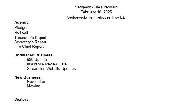 Feb102025 Board Meeting Held at: Fire House #1. 18645 State Hwy EE, Sedgewickville. MO 63781 7:30 PM Agenda